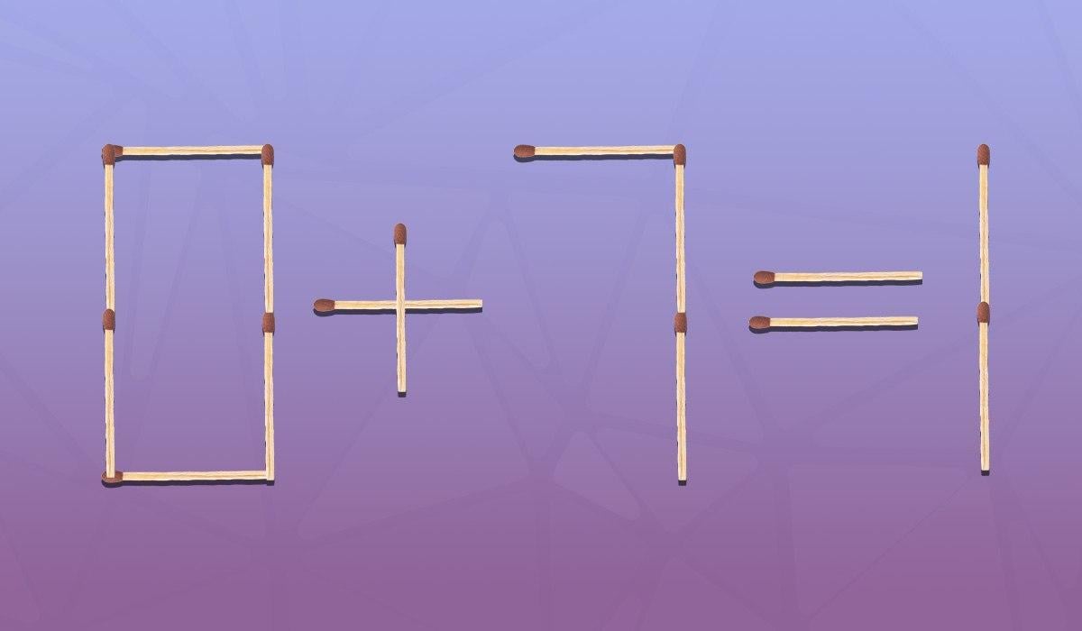 Qui di seguito viene mostrata un’immagine in cui l’uglianza 0+7=1 viene disposta utilizzando i fiammiferi. Ovviamente c’è un errore. Il vostro compito è quello di correggere l’uglianza apportando una piccola modifica.