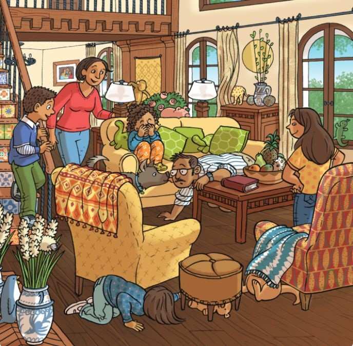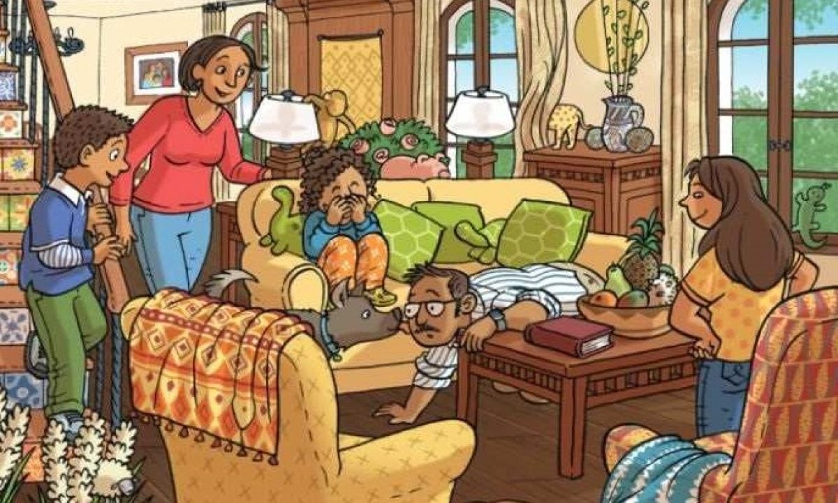 Nell’immagine vediamo una famiglia che ha perso qcosa e sta cercando di ritrovarla. Gli oggetti smarriti sono un pennello e una spazzola. Papà, mamma e i loro figli stanno cercando senza successo di ritrovare gli oggetti smarriti, ma non ci sono ancora riusciti. Dovete aiutare la famiglia nella ricerca.