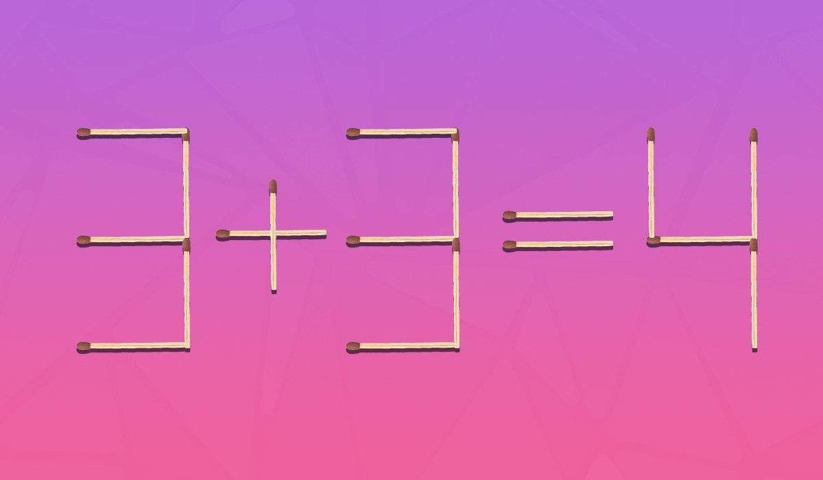 Di seguito vedrete un’immagine in cui l’uglianza 3+3=4 è disposta con dei fiammiferi. Da un punto di vista matematico non è corretta, perché la risposta dovrebbe essere sei.