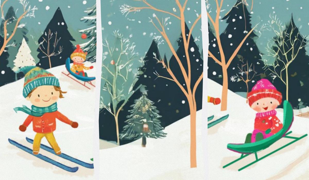 Davanti a voi c’è un gruppo di bambini felici che si godono la neve e il vero clima invernale nella foresta. I più piccoli vanno in slitta e i loro amici più grandi sciano.