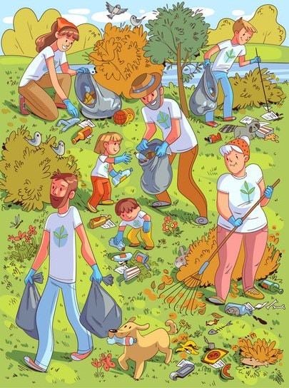 L’immagine mostra delle famiglie con bambini, che sono venuti al parco per pulire i rifiuti. Ci sono anche uccelli e un procione che osservano ciò che accade. Ma bisogna trovare la tartaruga.